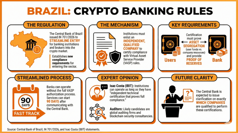The Central Bank of Brazil has issued new rules for banking institutions and brokers operating with crypto assets in the country. Instruction IN 701/2026 stipulates that they must be certified by an independent company to comply with the established requirements, including the segregation of assets.